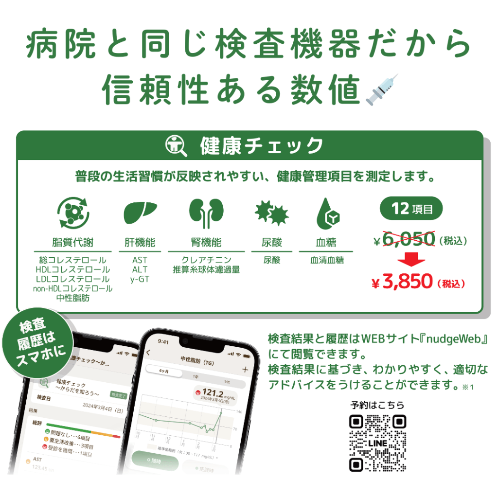 2025年4月から栄養相談に続いて、指先で簡単採血検査ができるようになりました。ナッジヘルスケアさんと地域の健康を支えていけることに嬉しく思います。
